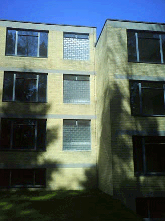 Auch der Wegebelag der Veranda im NW-Hof wird mit Solnhofer Platten 30/30cm von einheimischen Materialien bestimmt.Die Gärten der Lehrerwohnungen sind deutlich gegliedert und einfach bepanzt. Trotzdem scheint, wie schon im Freidorf, eine ergänzende individuelle Bepanzung durch die Hausbewohner nicht passend oder erwünscht.